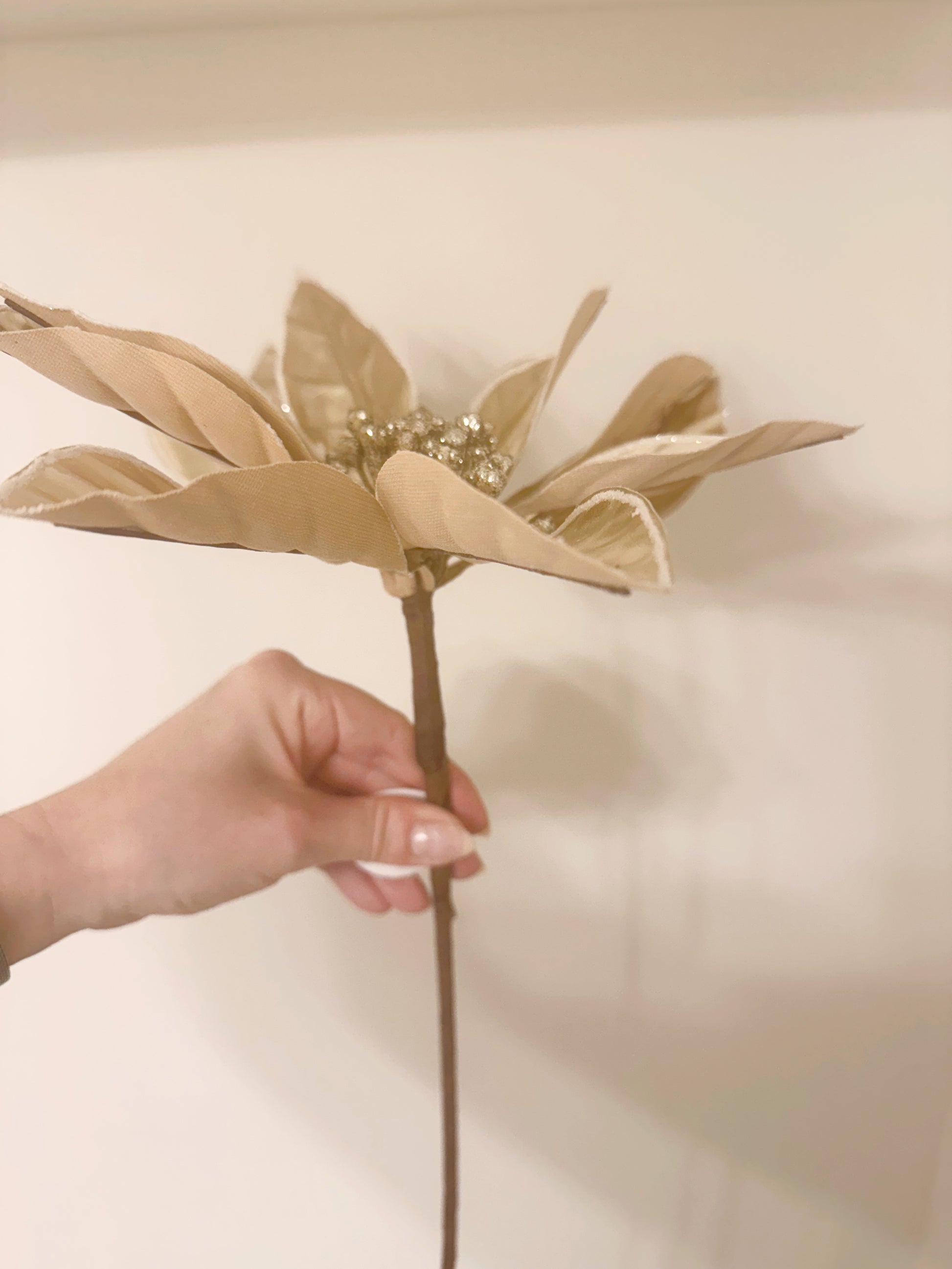 Our 20” Gold Poinsettia Stem embodies glamour and sophistication. Inspiring a sense of warmth and glamour on your tree or arrangements.
